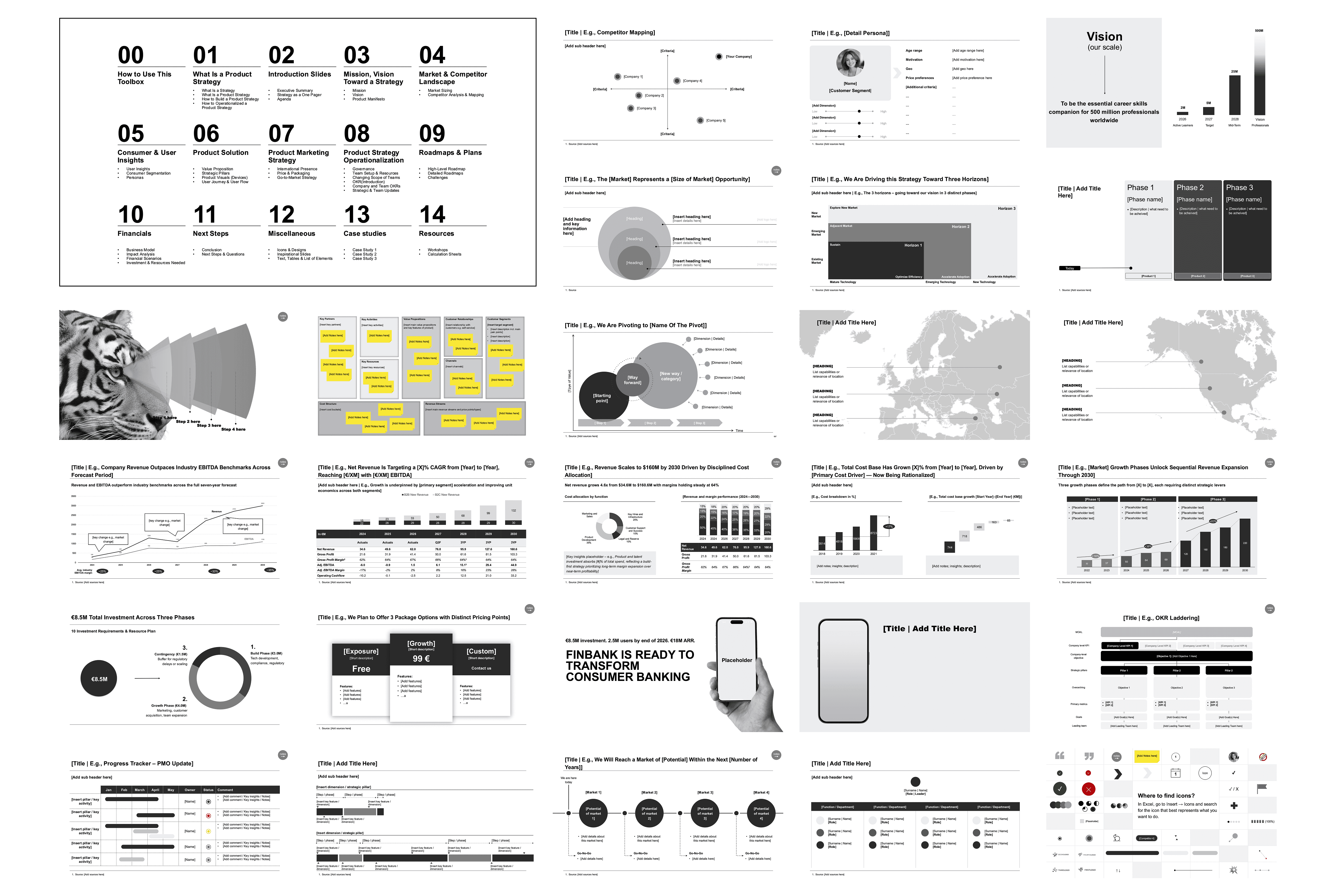A slide library organized into 15 sections from executive summary and mission/vision through market analysis, product solution, go-to-market, operationalization, roadmaps, financials, and case studies.