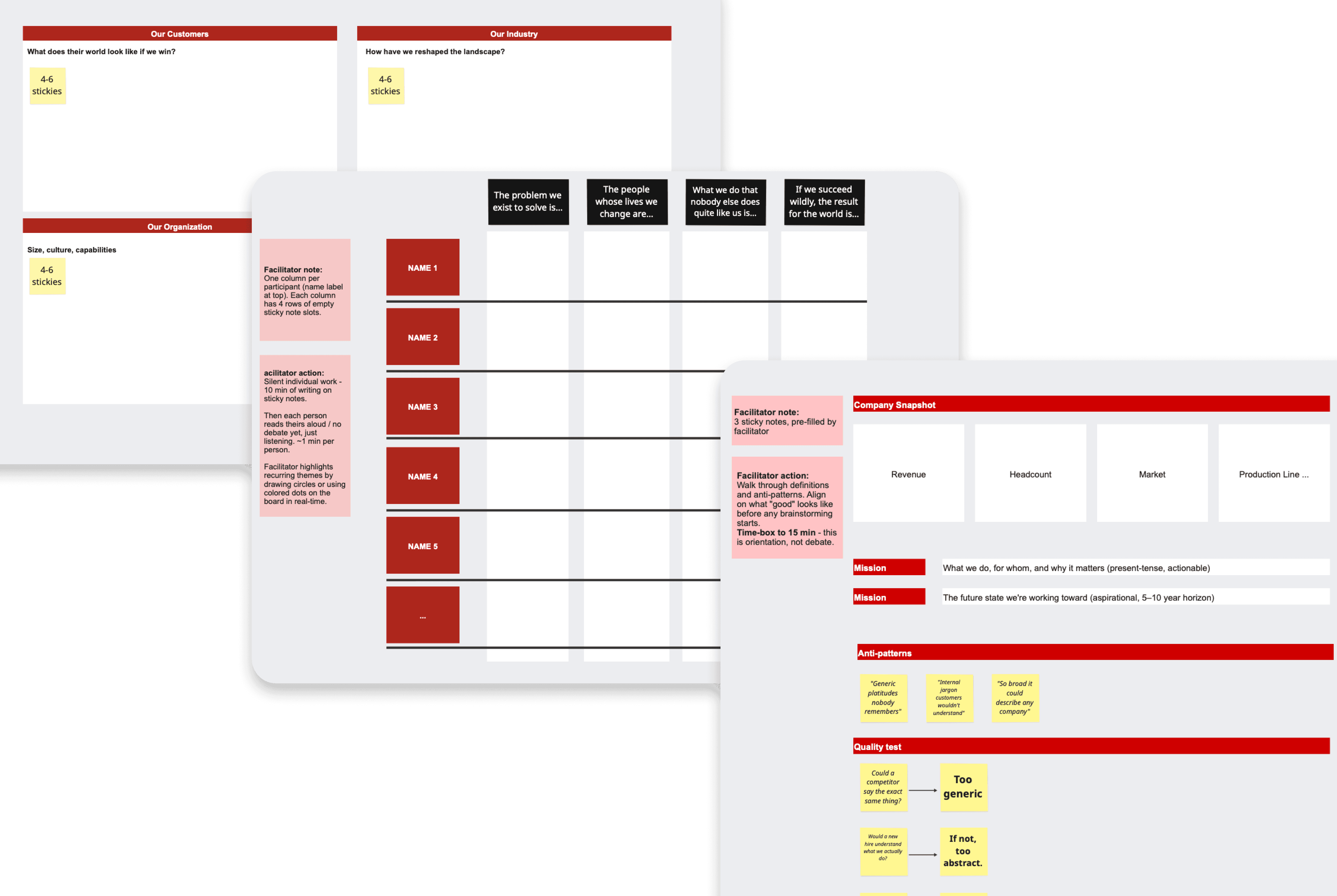 Each template includes structure, timing, and facilitation notes so you can run the session yourself (no external facilitator needed!). Designed for silent-first collaboration so every voice is heard.
